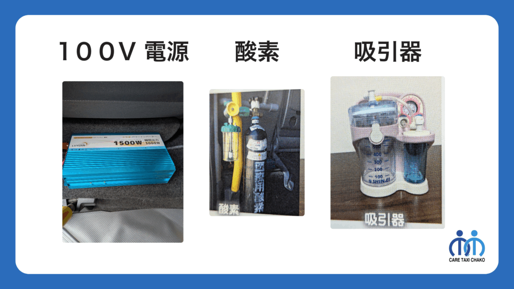 酸素ボンベ | ¥2,200/100ℓ超過料金 1ℓ毎10円 | 移送時に酸素吸入が必要な方 |
